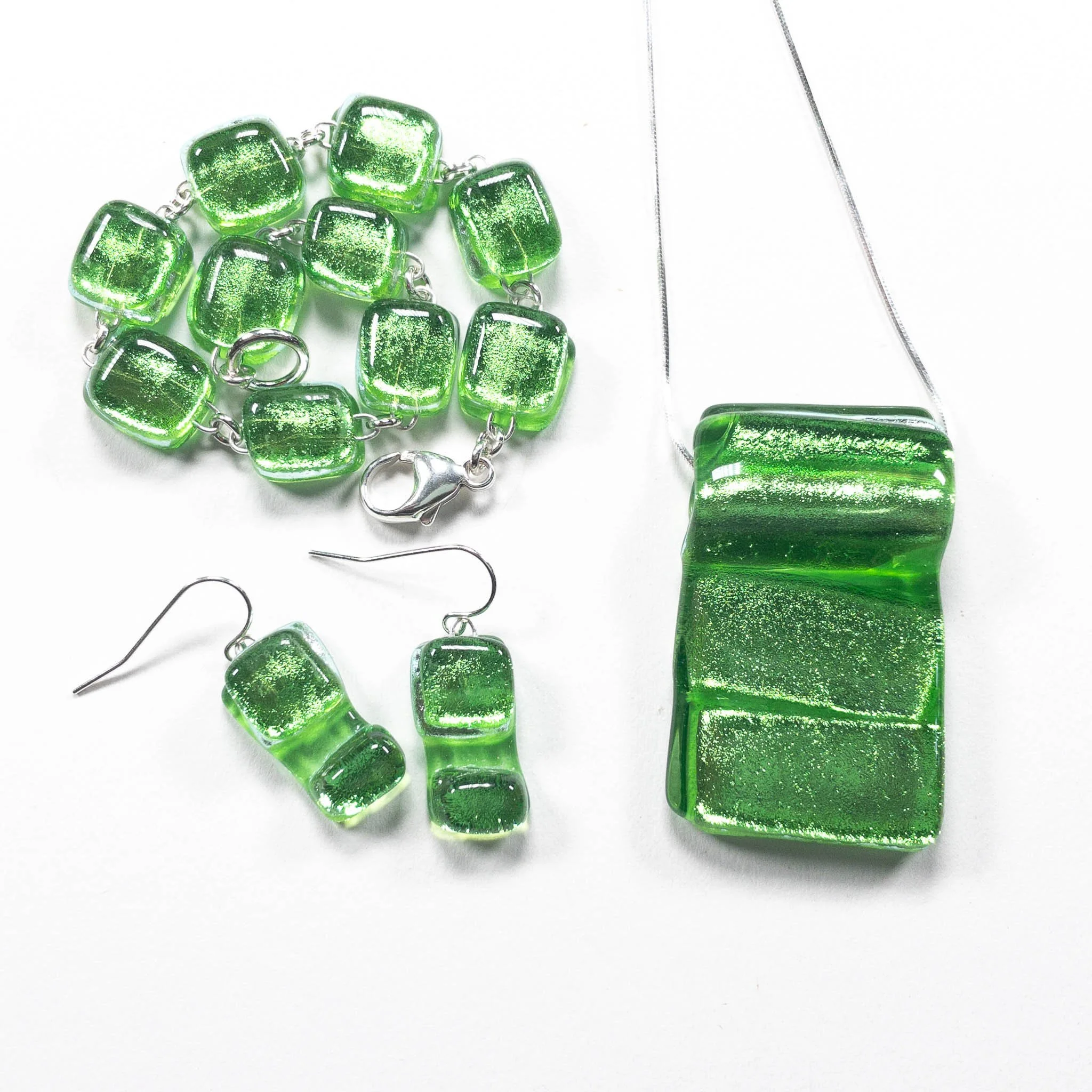 My work begins as flat sheets of dichroic glass that I cut, layer, and fire in a kiln at nearly 1500 degrees. Through multiple firings, the glass transforms into luminous stones that shift and shimmer in the light. I set these elements into clean, wearable forms that allow the color to take center stage.