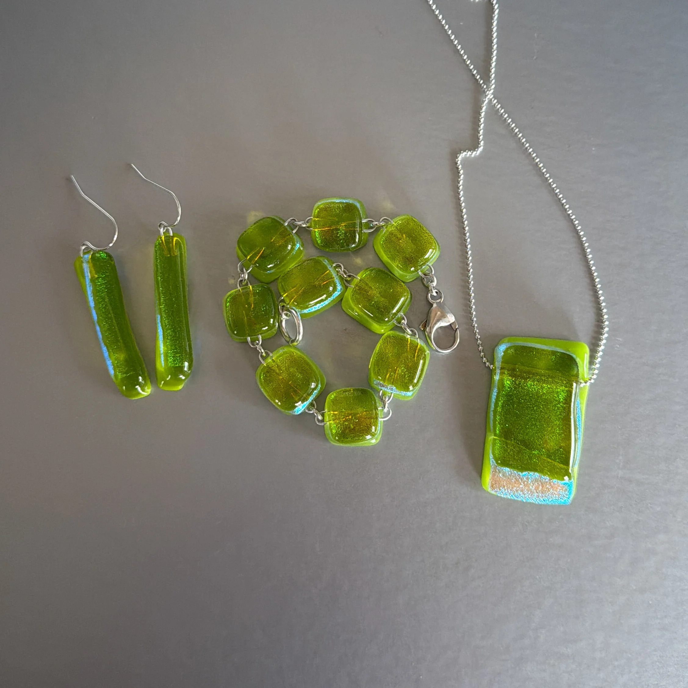 Each piece begins as layers of glass. Sheets of neon blue dichroic glass are paired with opaque gray and carefully layered before being kiln-fired into a single luminous stone. After firing, the glass is coldworked and gently tumbled in sand to create a soft matte surface that echoes the worn texture of island granite. The finished stones are then set with sterling silver, allowing the color to take center stage.